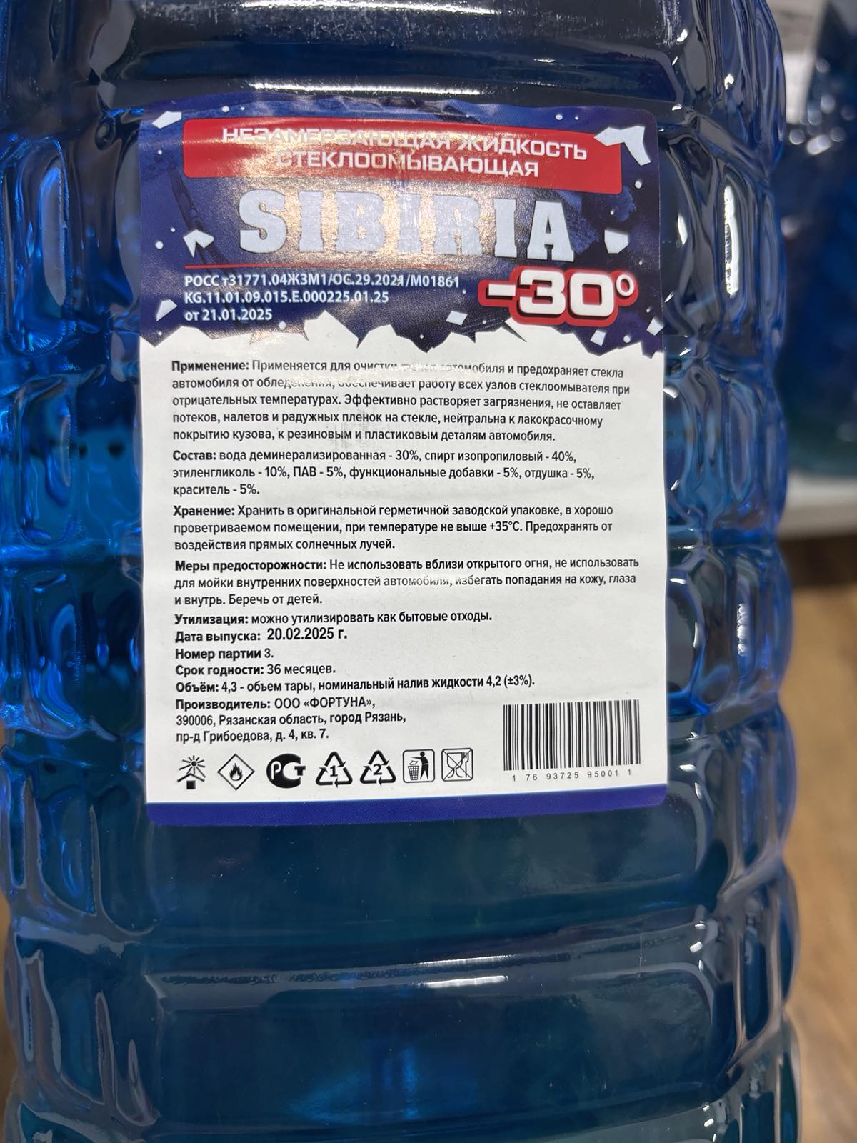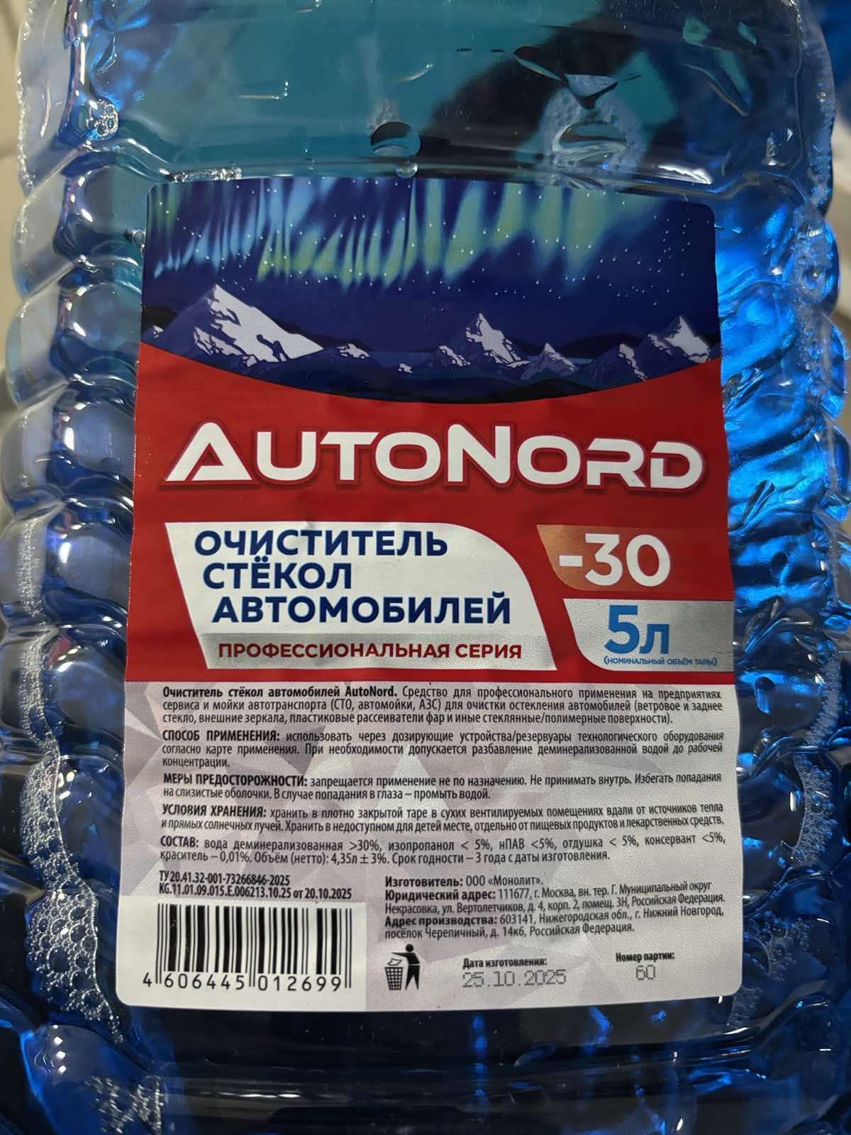 -очиститель стекол автомобилей «AutoNord -30», номинальный объём тары 5 л, дата изготовления 25.10.2025. номер партии 60, срок годности: 3 года с даты изготовления: ООО «Монолит», юридический адрес: 111677, г. Москва, вн, тер. Г. Муниципальный округ Некрасовка, ул. Вертолетчиков, д. 4, корп. 2, помет. ЗН, Российская Федерация, адрес производства: 603141, Нижегородская обл., г. Нижний Новгород, посёлок Черепичный, д. 4 каб. 16 Российская Федерация.