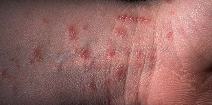 В местах внедрения клеща в кожу (чаще всего межпальцевые промежутки, а также область половых органов и ягодиц) появляется характерная везикулярная сыпь и отмечается зуд.